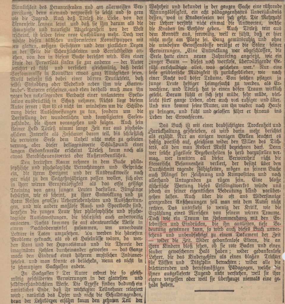 Das Buch ist mit einer beabsichtigten Trockenheit und Zurückhaltung geschrieben, es wird darin mehr berichtet als erzählt. Nur an einigen Stellen leuchtet es hastig poetisch auf, gleichsam wider den Willen des Dichters, als den man Robert Musil bezeichnen darf. Denn wer solche zügellosen Begebenheiten so herb darzustellen vermag, wer inmitten all dieser Verwirrtheit nicht die literarische Besonnenheit verliert, der besitzt über den Durchschnitt ragende Fähigkeiten, mögen an seinem Buche auch Mängel der Zeichnung und Komposition und noch allerhand Untugenden zu rügen sein. Eine bloße ästhetische Wertung dieses Erstlingswerks würde uns jedoch an seiner eigentlichen Bedeutung blind vorübergehen lassen. Auch über die oft ans Widersinnige grenzenden Anschauungen soll man mit dem Autor nicht rechten. Das untersteht so wenig der Kritik, wie die Erzählung eines Menschen von seinem wirren Traume. Doch wie ein Traum im Zusammenhang mit den Erlebnissen und Eindrücken, die ihn auslöten, tiefe Bedeutung gewinnen kann, so wird auch dieses Buch unversehens und unbeabsichtigt zu einem Dokument der Zeit – wider die Zeit. Wider gedankenlose Eltern, die an ihren Kindern bloß sehen, ob sie rote Backen und einen sauber gewaschenen Hals haben; wider gedankenlose Lehrer, die das Kindergehirn als einen blaßen Trichter für Wissen und Disziplin betrachten, wider alle die dilettierenden und berufsmäßigen Pädagogen, welche die ihnen ausgelieferte Jugend nicht verstehen, weil sie ihre eigene vergessen oder weil sie überhaupt niemals eine gehabt haben.