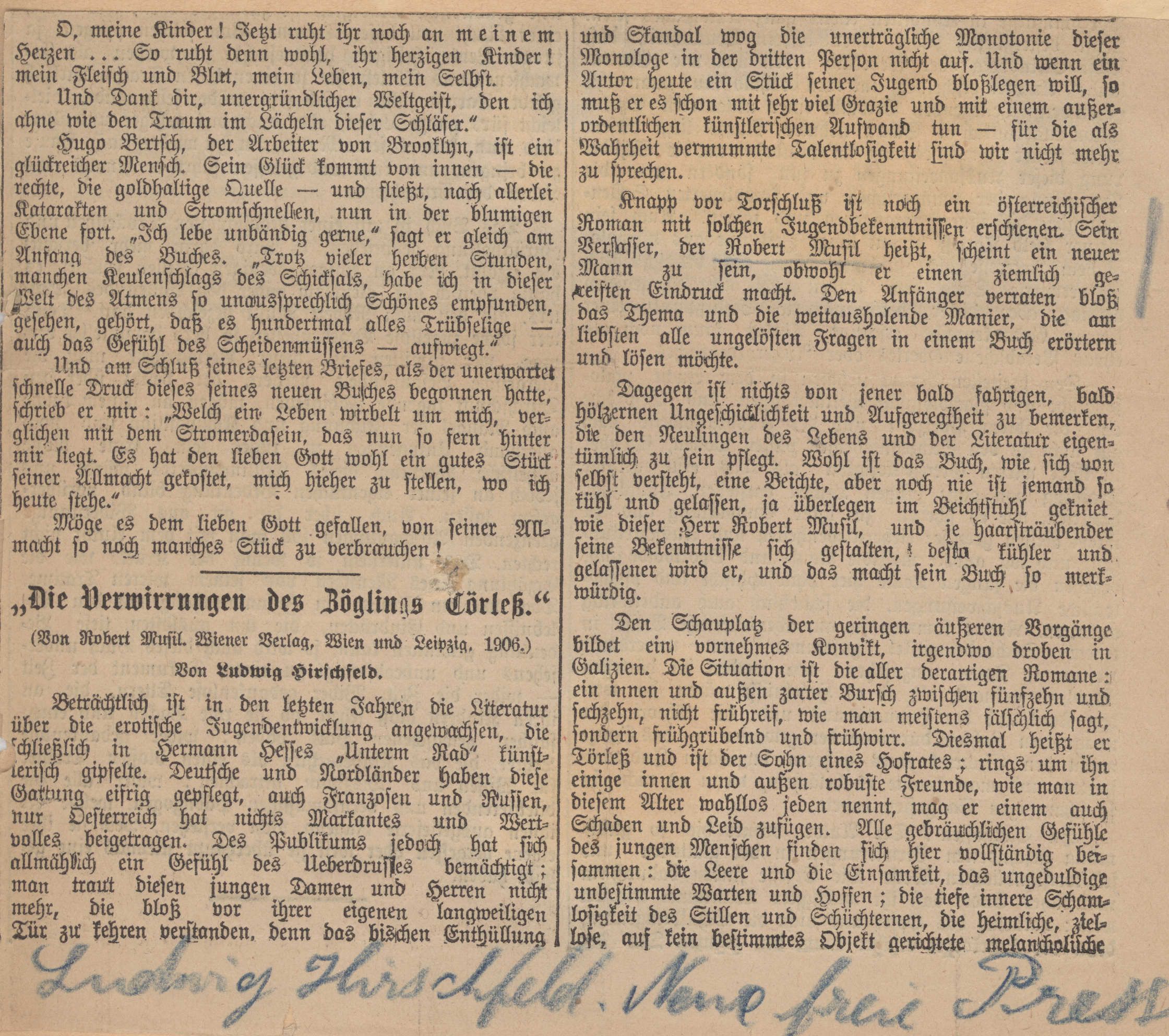 Robert Musil ist in Südösterreich geboren, fünfundzwanzig Jahre alt, und hat ein Buch geschrieben, das bleiben wird. Er nennt es: „Die Verwirrungen des Zöglings Törleß“. Der Wiener Verlag bringt es heraus. In diesem jungen und wohl bald verrufenen, verzeterten, bespienen Werk, das auf den Index ornatloser Piassen gesetzt wird, wenn ein halbes dutzend Menschen es nur erst gelesen hat, sind Meisterstrecken. Das Starke seines Werkes liegt in der ruhigen, verinnerlichten Gestaltung abseitiger Dinge dieses Lebens, – die eben doch in diesem Leben sind. Die unser Hexenprozeßverfahren heute straft. „Nachtseiten“ sagt der Feuilletonist; also Nachtseiten. Für jeden sind sie nicht vorhanden: insofern kein Leib aber die Konjunktur seines Schicksals es mit sich brachten, daß er in seiner dieser Nebenwelten je geriet; aber vorhanden sind sie.