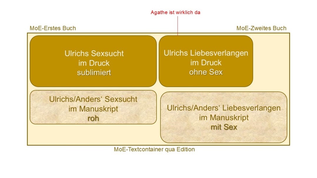 {4} Wie die Grafik zeigt, wird im Mann ohne Eigenschaften noch ein zweiter Mythos beschworen, neben Spaltungsmythen der Sexualität nach dem Muster von Don Juan und Casanova sind es Vereinigungsmythen der Liebe nach platonischen Mustern, Ausdruck eines unstillbaren Liebesverlangens des Mannes ohne Eigenschaften. Der Roman versteht sich in den Worten der weiblichen Hauptfigur als „die letzte Liebesgeschichte, die es geben kann“, dem Autor zufolge schreibe er „ja sozusagen die letzte Liebesgeschichte“. Auch die Liebe erhält im Mann ohne Eigenschaften nicht nur eine mythische, sondern auch eine logische Gestaltung, ist ebenfalls Gegenstand einer multiplen Kulturdiagnose. Sexualität und Liebe gehen in dem Roman nie in eins, sondern sie verhalten sich zueinander komplementär, ausgedrückt in dem Bild von den zwei Bäumen des Lebens, dem Baum der Liebe und dem Baum der Gewalt. Der Roman erzählt die Geschichte einer mühsamen und redseligen Ablösung und Befreiung eines Mannes von seiner Sexsucht durch Liebesverlangen; die Wende ist durch Ulrichs Begegnung mit seiner Schwester Agathe, vorgezeichnet, die das Erste Buch des Romans vom unvollendeten Zweiten Buch trennt, irreversibel markiert erst im Kapitel 24 Agathe ist wirklich da.