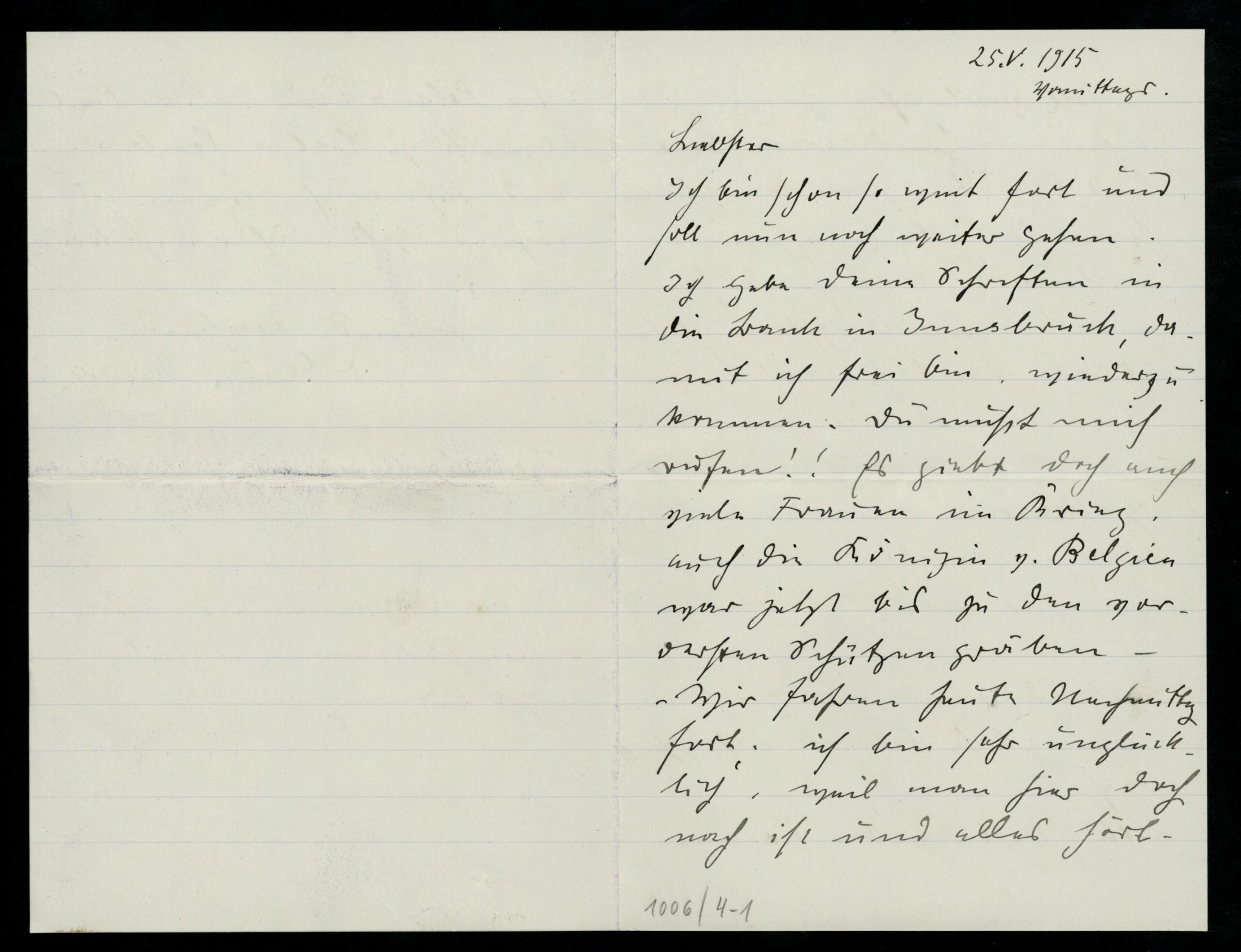Ich bin schon so weit fort und soll nun noch weiter gehen. Ich gebe Deine Schriften in die Bank in Innsbruck, damit ich frei bin, wiederzukommen. Du mußt mich rufen! Es gibt doch auch viele Frauen im Krieg, auch die Königin von Belgien war jetzt bis zu den vordersten Schützengräben. – Wir fahren heute nachmittag fort; ich bin sehr unglücklich, weil man hier doch nah ist und alles hört.