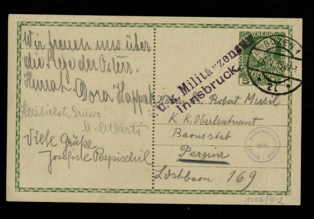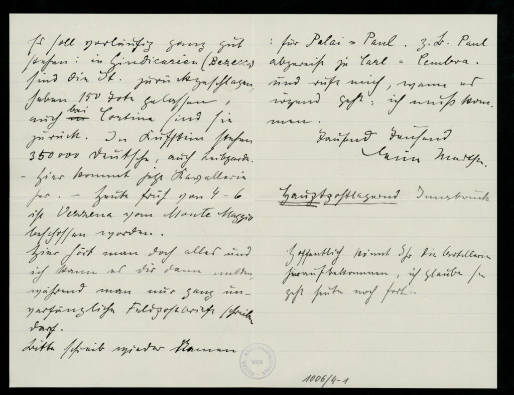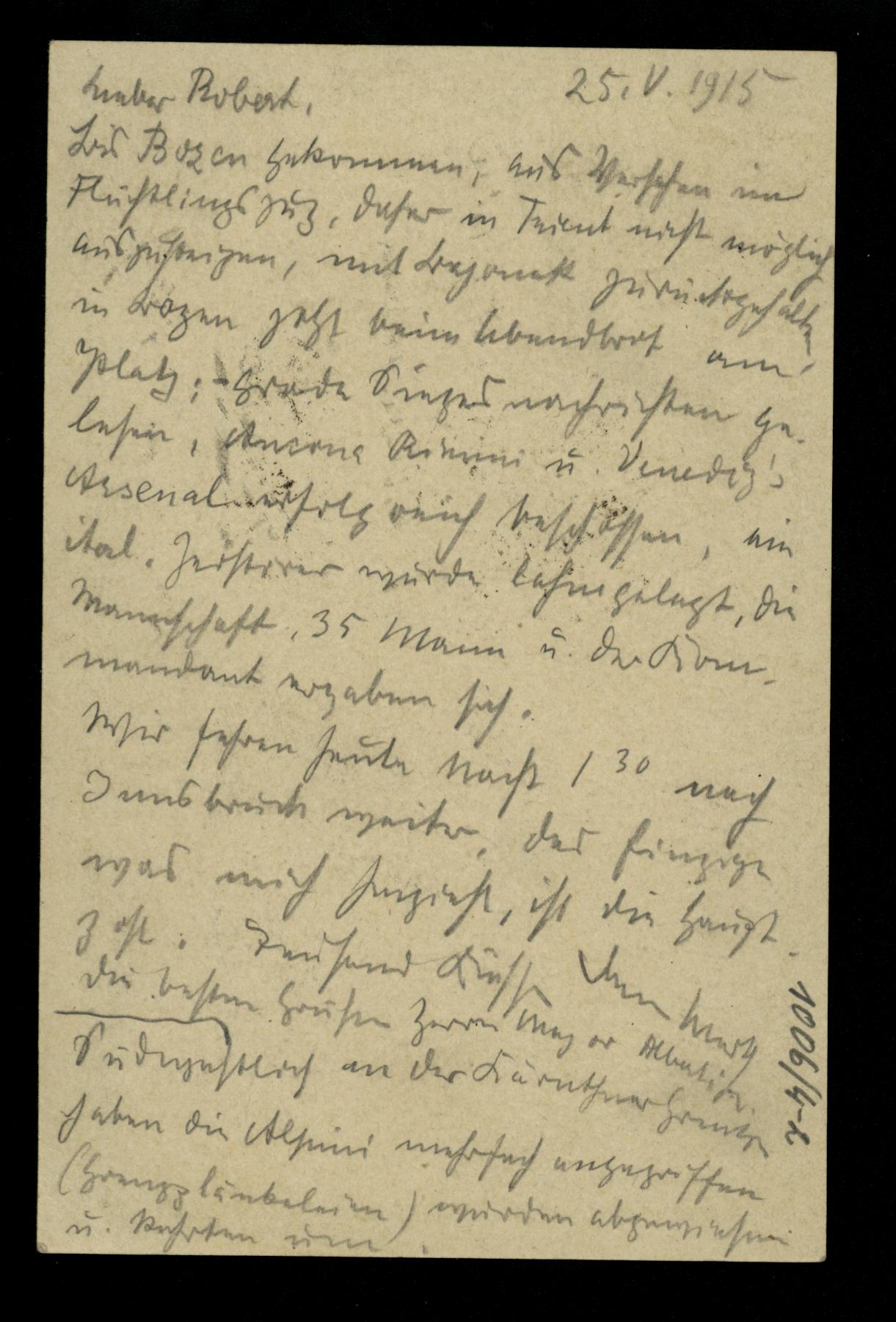 Es soll vorläufig ganz gut stehen: in Giudicarien (Bezecca) sind die Italiener zurückgeschlagen, haben 150 Tote gelassen, auch bei Cortina sind sie zurück. In Kufstein stehen 350.000 Deutsche, auch Leibgarde. – Hier kommt jetzt Kavallerie her. – Heute früh von vier bis sechs ist Vezzena vom Monte Maggio beschossen worden. Hier hört man doch alles, und ich kann es Dir dann melden, während man nur ganz unverfängliche Feldpostbriefe schreiben darf.